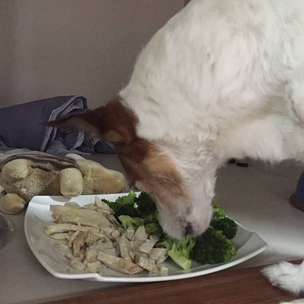 飯店服務很好,為巧比準備早晚餐還問我要幾點餵食,晚上我點了水煮雞肉+花椰菜。