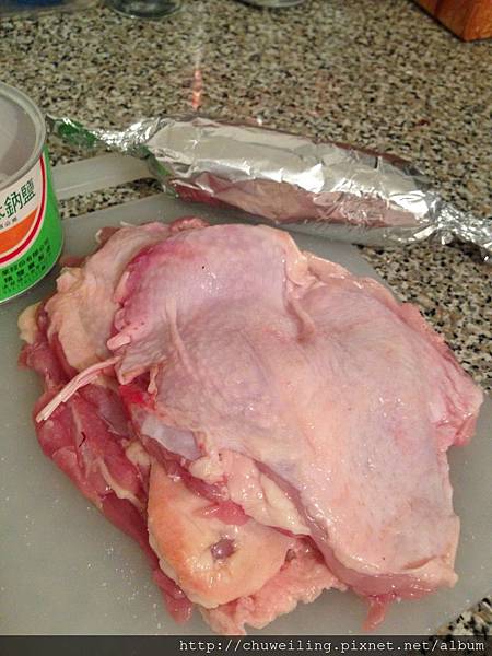 1.先將去骨雞腿洗淨,然後灑鹽在兩面,用錫箔紙將雞腿包成圓桶狀,記得兩邊口要轉緊封好。