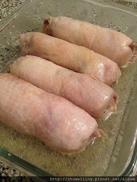 2.將雞腿放入電鍋(也可放入滾水煮),外鍋約1杯水直到電鍋跳起。